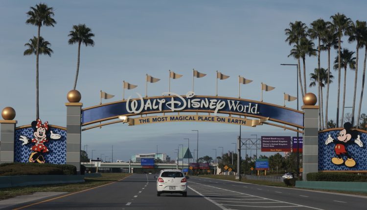 A sign welcomes visitors near an entrance to Walt Disney World on February 01, 2024, in Orlando, Florida.