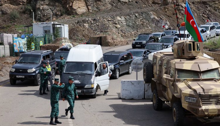 Azerbaijan soldiers regulate traffic as refugees wait in their cars to leave Karabakh for Armenia, at the in Lachin border, on Sept. 26, 2023.