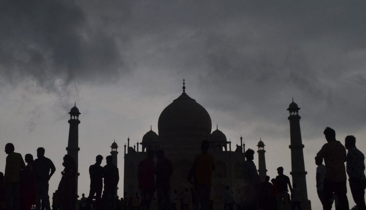 Visitors are silhouetted against the dark clouds at Taj Mahal in Agra on September 20, 2022.