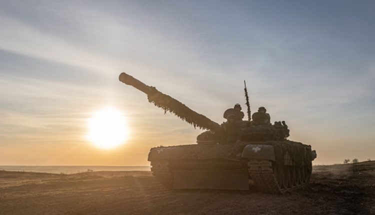 Ukrainian soldiers drive a tank during a military training at an undetermined location.