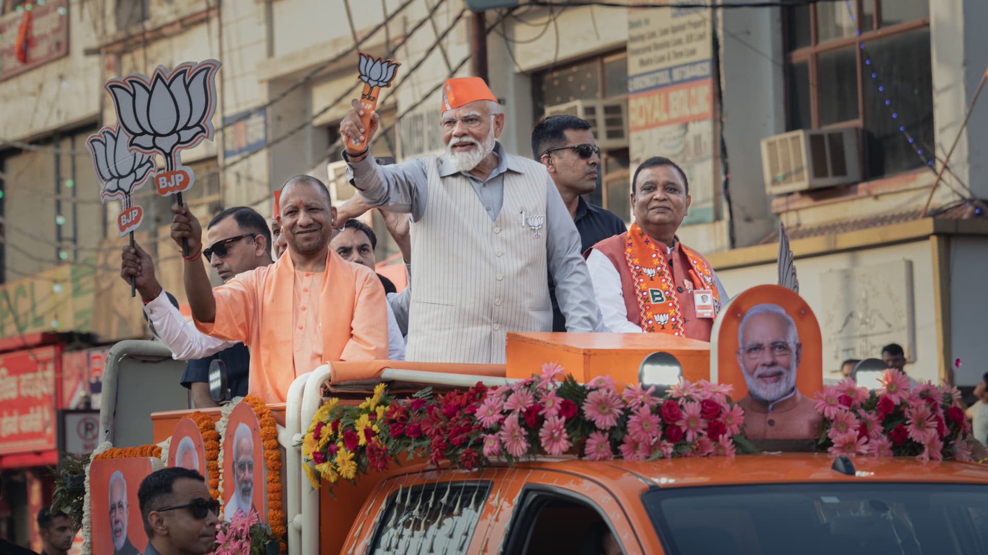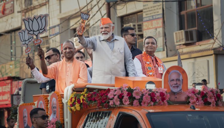 Narendra Modi, India’s prime minister, center, during a campaign rally in Agra, Uttar Pradesh, India, on Thursday, April 25, 2024. Modi doubled down on his attacks against the main opposition party by using language critics say sows division between the country’s Hindu majority and Muslim minority. Photographer: Prakash Singh/Bloomberg via Getty Images