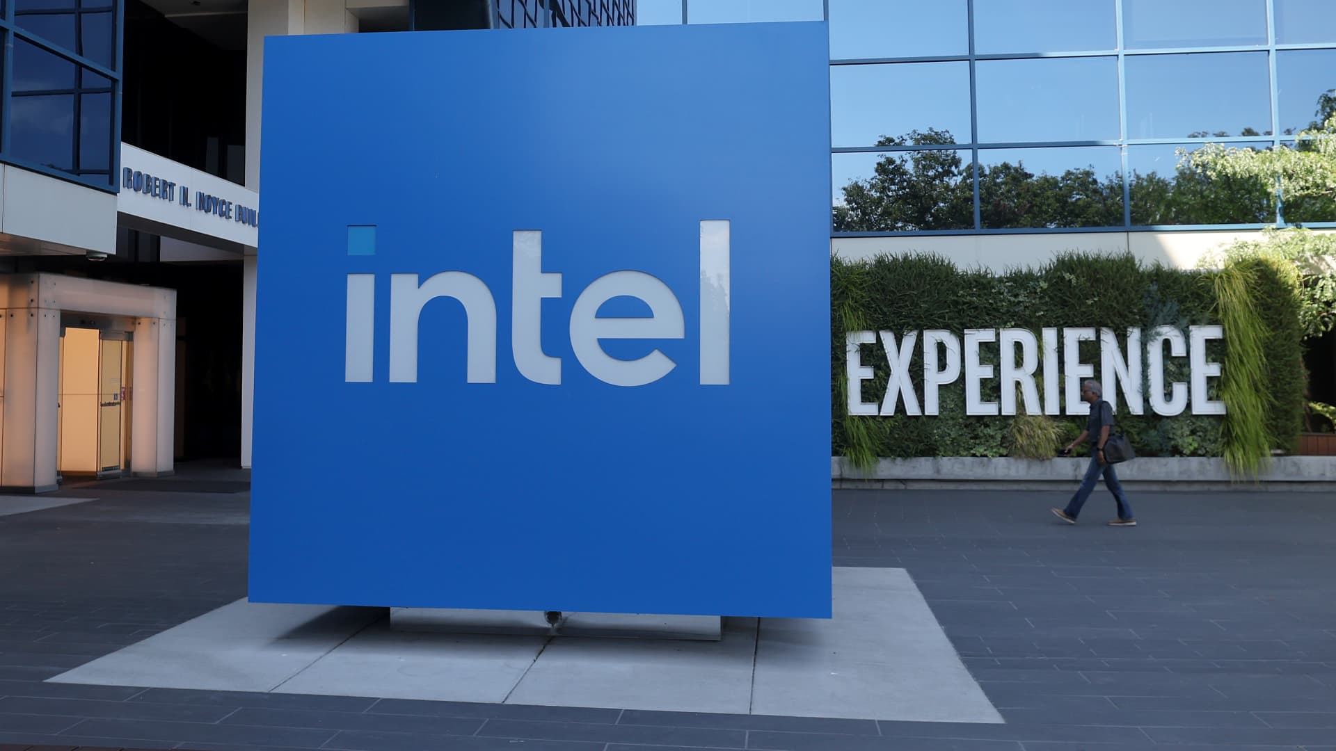 A sign is posted in front of Intel headquarters on August 01, 2024 in Santa Clara, California.