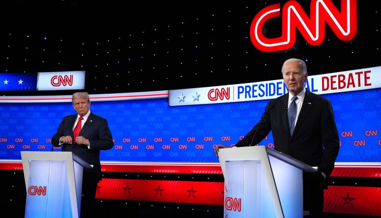 Former President Donald Trump, left, and President Joe Biden face off in the first debate of the 2024 presidential campaign, in Atlanta, June 27, 2024.