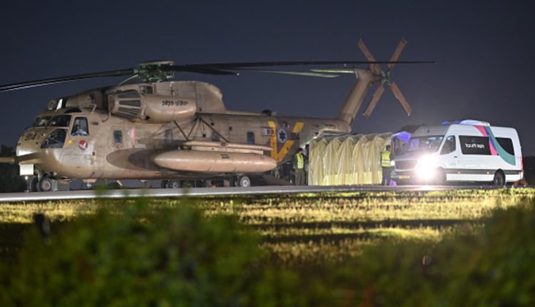 A helicopter with Israeli hostages released earlier by Hamas lands at Sheba Medical Centre on the sixth day of the temporary truce after Hamas blamed ‘technical issues’ on the delay as family and friends wait nearby in the early morning hours of November 30, 2023 in Ramat Gan, Israel.