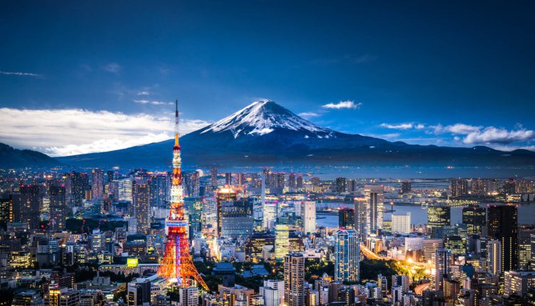 View of Mount Fuji and the Tokyo skyline at dusk.