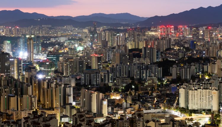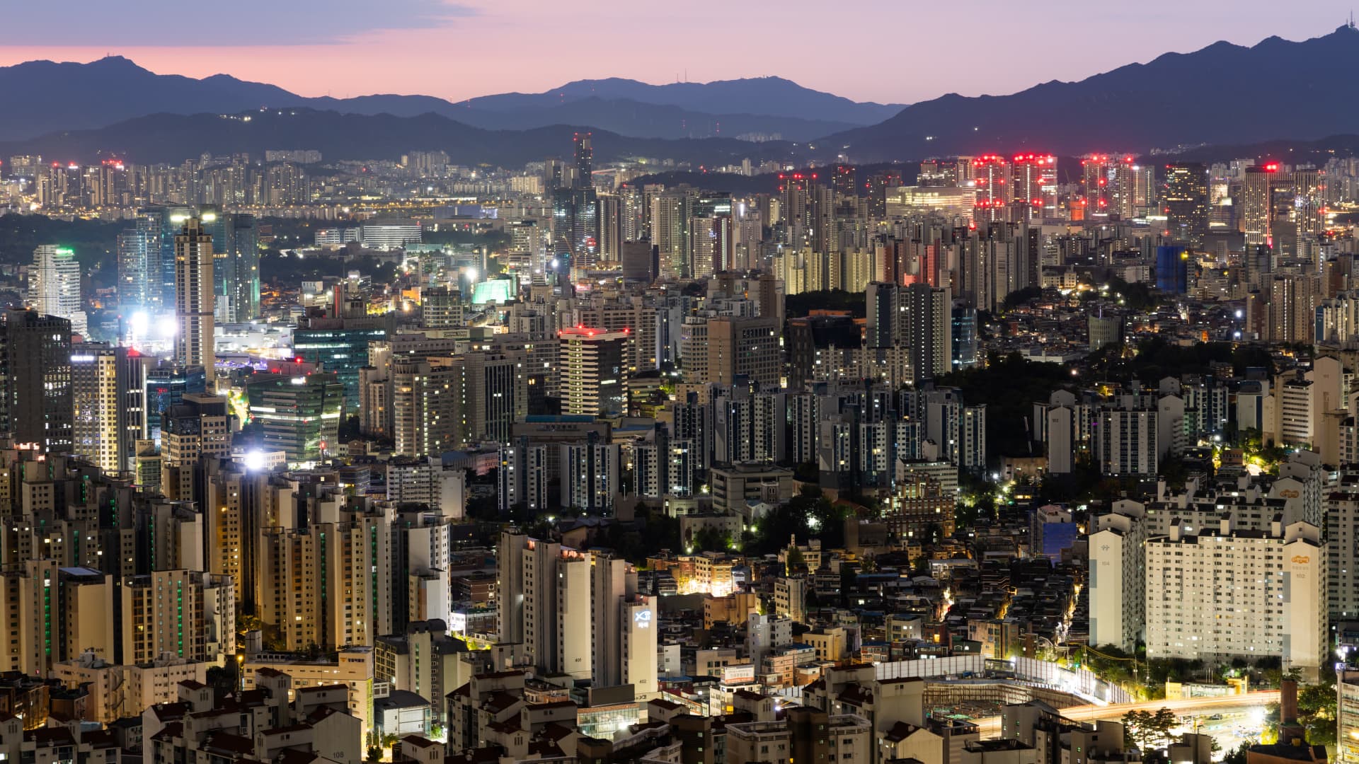 Commercial and residential buildings are illuminated at dawn in Seoul, South Korea, on Saturday, Oct. 21, 2023. South Korea has prepared a financial support program of 75.9 trillion won ($56.97 billion) for companies increasing investment in key sectors as well as small businesses struggling with the impact of high interest rates.