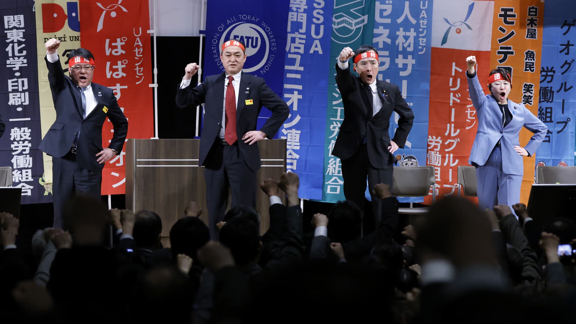 Akihiko Matsuura, president of UA Zensen, second left, raises his fist with members of the union during a rally for the annual wage negotiations in Tokyo, Japan, on Thursday, March 7, 2024.