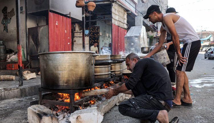 Children sit together around a boy cooking instant noodles on a fire in a make-shift oven from a recycled barrel, in Rafah in the southern Gaza Strip on October 31, 2023 amid ongoing battles between Israel and the Palestinian Hamas movement. (Photo by MOHAMMED ABED / AFP) (Photo by MOHAMMED ABED/AFP via Getty Images)