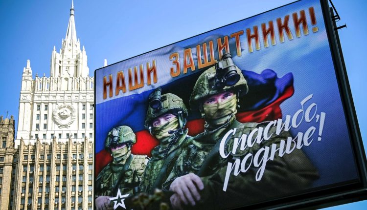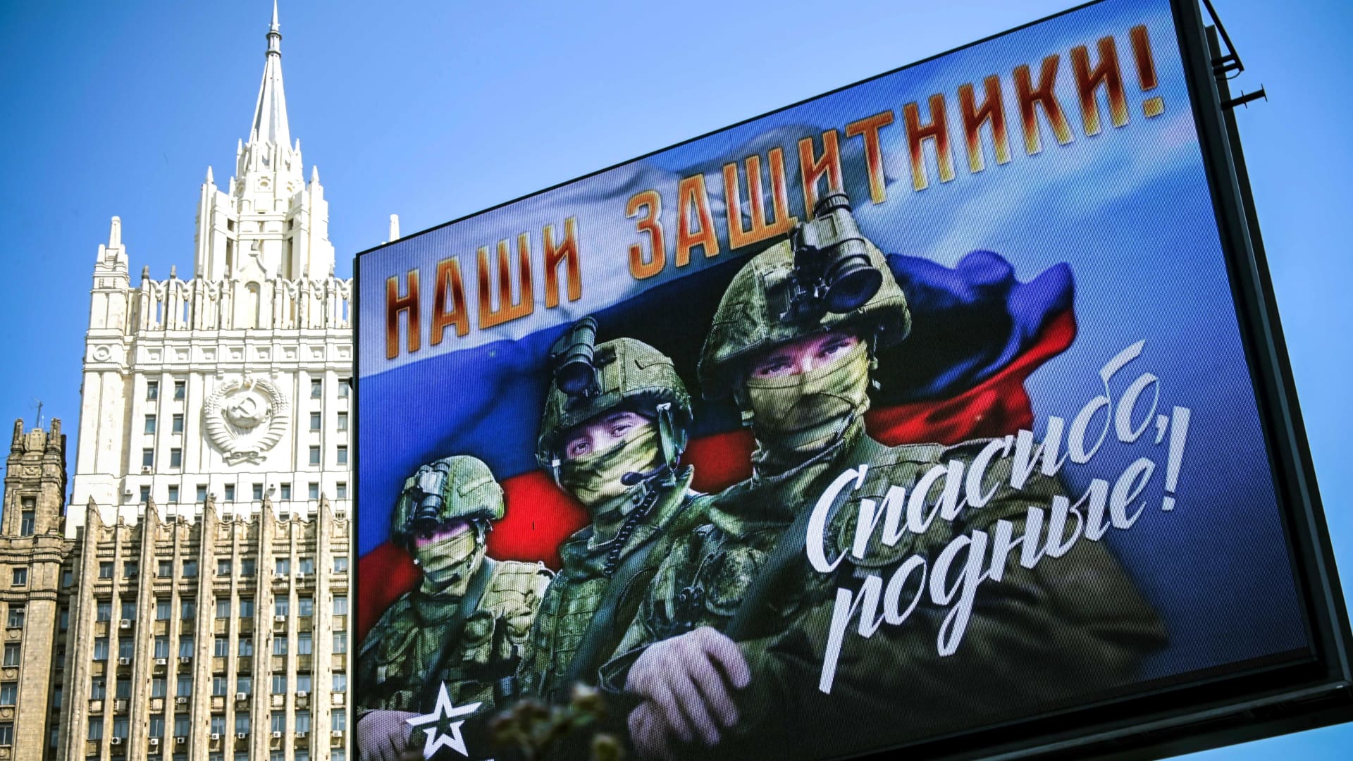 Russian Foreign Ministry building is seen behind the Army billboard reading “Our Defenders! Thanks Native Ones!” in Moscow on June 15, 2023.