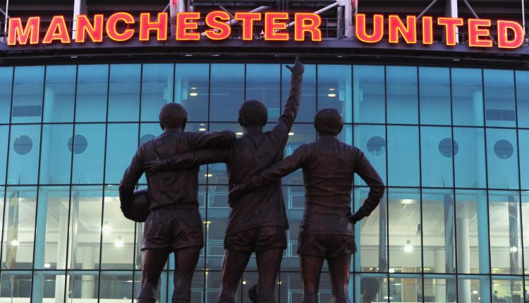 A statue of George Best, Denis Law and Bobby Charlton standing outside Old Trafford, home of Manchester United in Manchester, England.