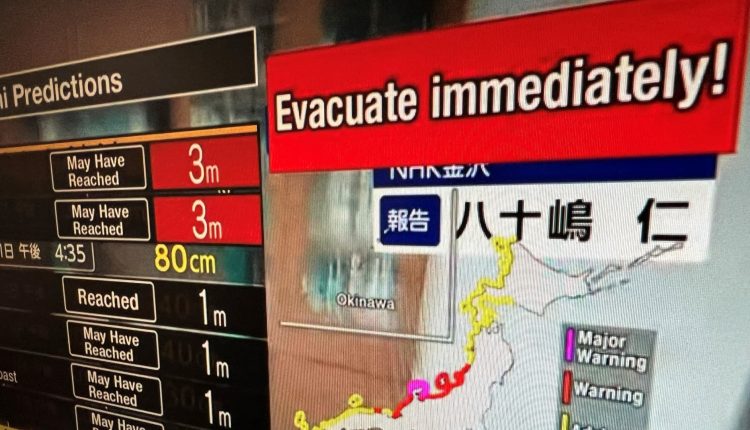 TOPSHOT – This image taken in Hong Kong on January 1, 2024 shows a warning message on a screen from a live feed on NHK World asking people to evacuate from the area after a series of major earthquakes hit central Japan. A powerful 7.5 earthquake hit central Japan on January 1, the USGS said, prompting tsunami warnings and authorities to urge people in the area to move to higher ground. (Photo by Mladen ANTONOV / AFP) (Photo by MLADEN ANTONOV/AFP via Getty Images)