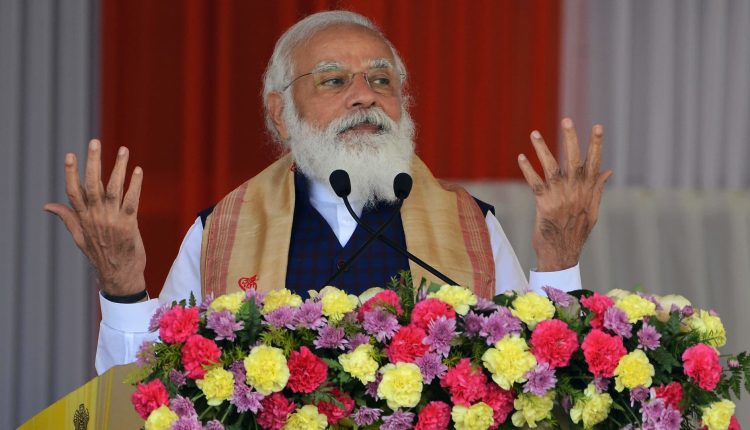 Indian Prime Minister Narendra Modi addresses a public meeting at Jerenga Pathar in the Sivasagar district of India’s Assam state on Jan. 23, 2021.