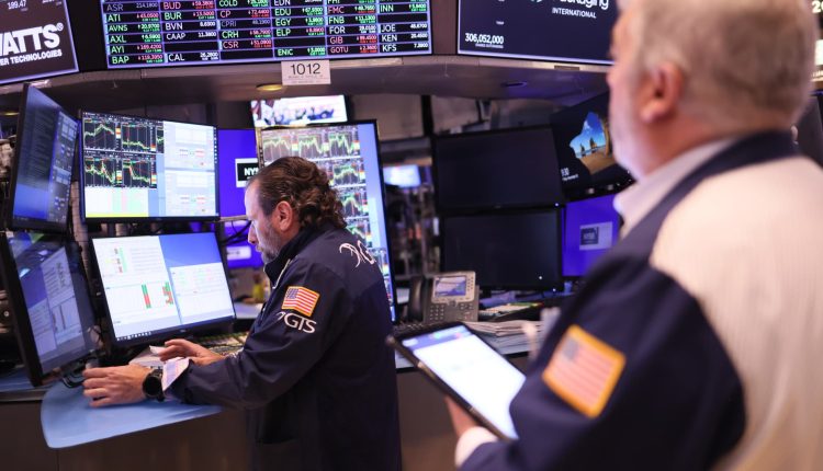 Traders work on the floor of the New York Stock exchange during morning trading on November 10, 2023 in New York City.