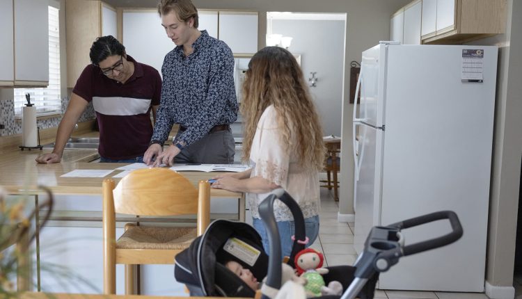 Ryan Ratliff, center, real estate sales associate with Re/Max Advance Realty, shows Ryan Paredes, left, and Ariadna Paredes a home for sale in Cutler Bay, Florida, on April 20, 2023.