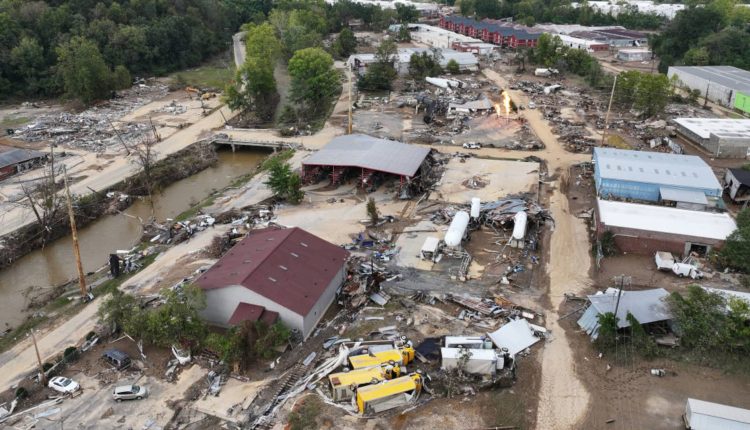 An aerial view of flood damage wrought by Hurricane Helene along the Swannanoa River on October 3, 2024 in Asheville, North Carolina.