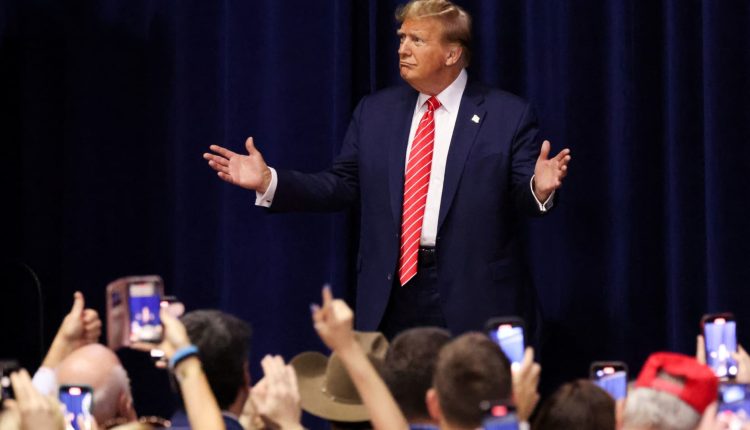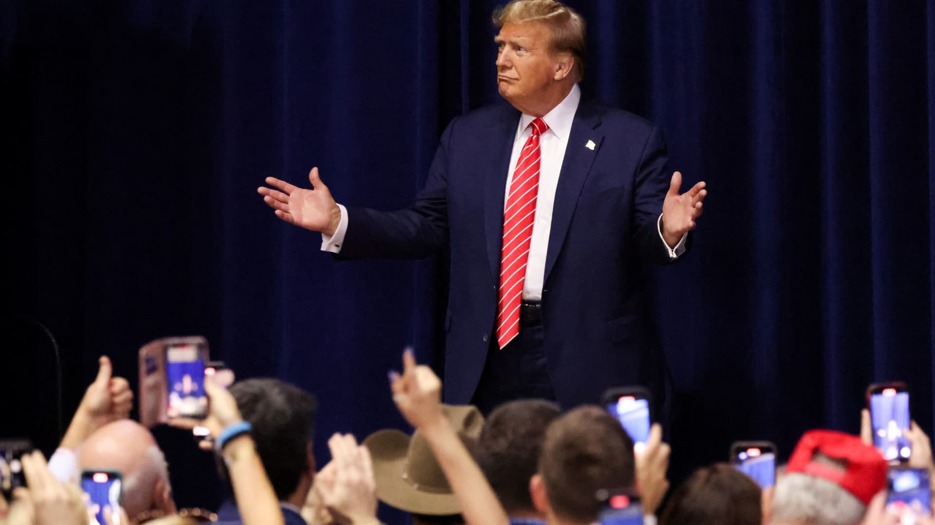 Republican presidential candidate and former U.S. President Donald Trump gestures to supporters as he hosts a campaign rally at the Forum River Center in Rome, Georgia, U.S. March 9, 2024.