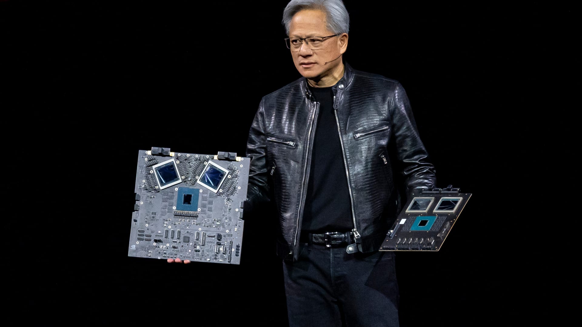 Jensen Huang, co-founder and CEO of Nvidia, displays the new Blackwell GPU chip during the Nvidia GPU Technology Conference in San Jose, California, on March 18, 2024.