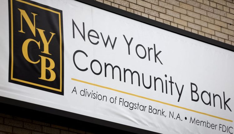 A sign is pictured above a branch of the New York Community Bank in Yonkers, New York, U.S., January 31, 2024.