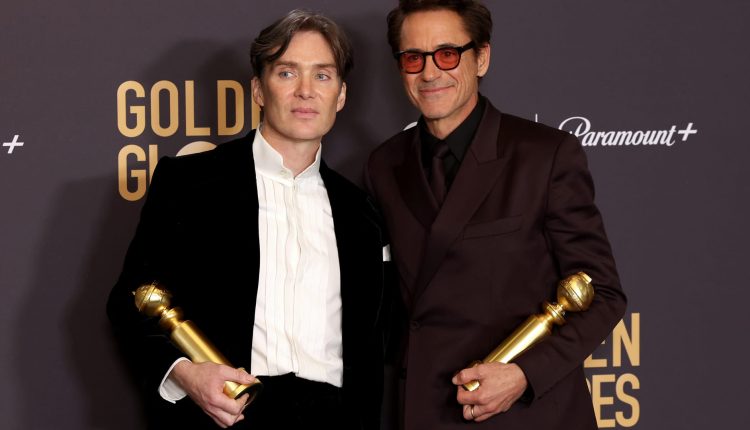 BEVERLY HILLS, CALIFORNIA – JANUARY 07: (L-R) Cillian Murphy, winner of the Best Performance by a Male Actor in a Motion Picture – Drama for “Oppenheimer,” and Robert Downey Jr., winner of the Best Performance by a Male Actor in a Supporting Role in a Motion Picture award for “Oppenheimer,” pose in the press room during the 81st Annual Golden Globe Awards at The Beverly Hilton on January 07, 2024 in Beverly Hills, California. (Photo by Kevin Mazur/Getty Images)