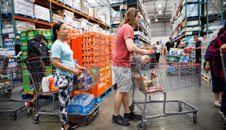 Customers wait in line to check out purchases at Costco store on June 28, 2023 in Teterboro, New Jersey. Costco is cracking down on membership card sharing at its stores.