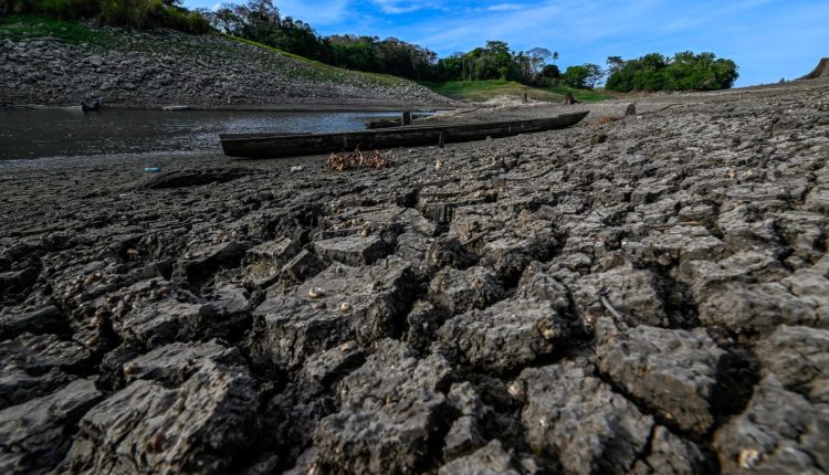 View of stranded boats at Alhajuela Lake during the summer drought, in Colon province, 50 km north of Panama City, Panama, on April 21, 2023. The Alhajuela lake is one of the main lakes that supplies water to the locks of the Panama Canal and is at its lowest level of recent years.
