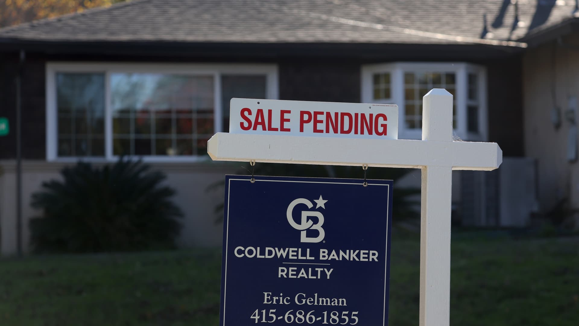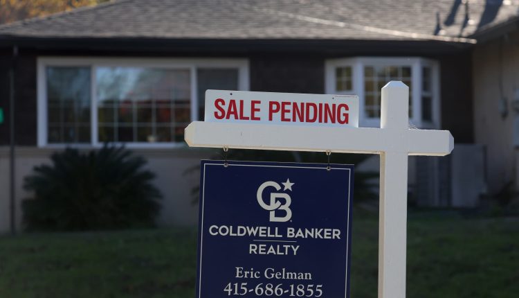 A “sale pending” sign is posted in front of a home for sale in San Anselmo, California, on Nov. 30, 2023.