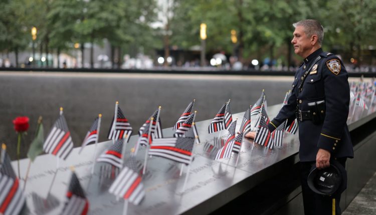 A New York police officer pauses at the National September 11 Memorial and Museum in New York City, ahead of the ceremony marking the 22nd anniversary of the 9/11 terrorist attacks, Sept. 11, 2023.
