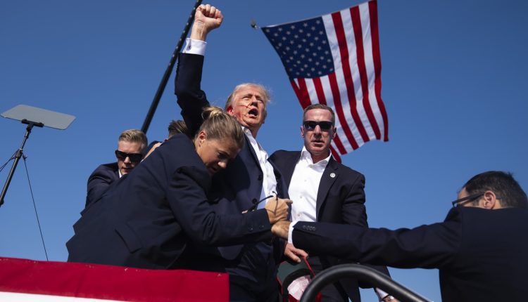 Republican presidential candidate former President Donald Trump is surrounded by U.S. Secret Service agents at a campaign rally, Saturday, July 13, 2024, in Butler, Pa.