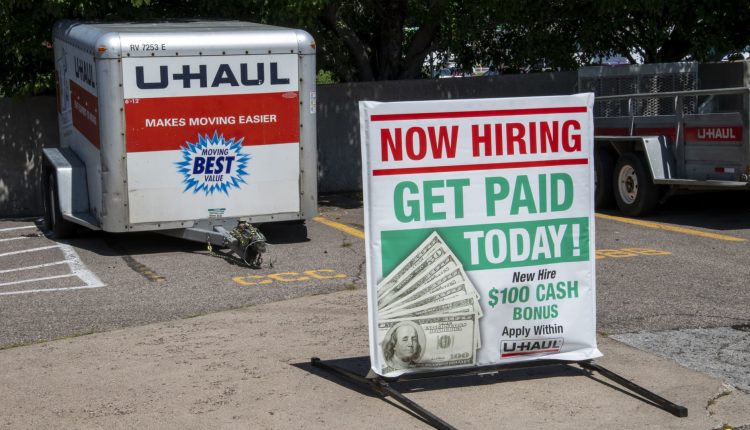 U-Haul hiring sign offering to get paid today and a bonus in New Brighton, Minnesota.