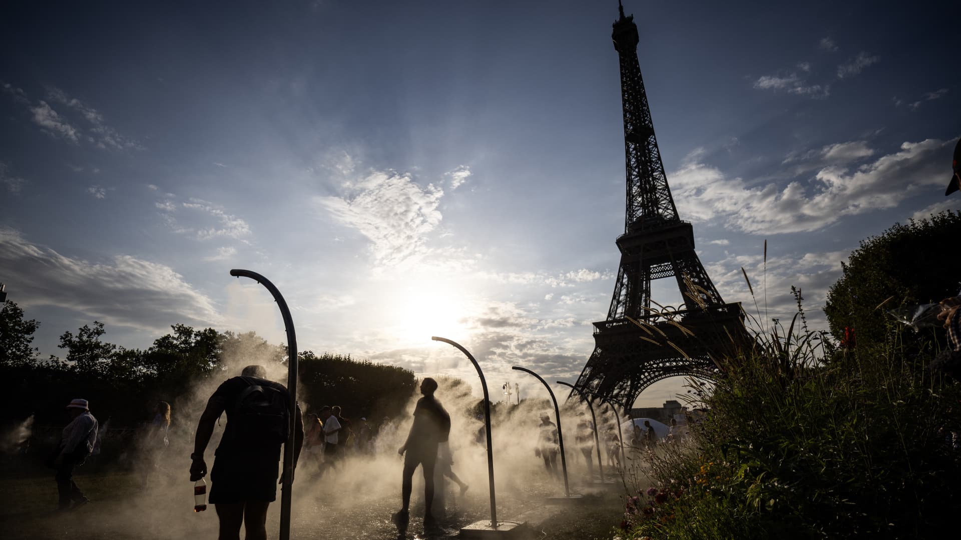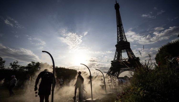 People cool off themselves with water sprays besides the Eiffel Tower in Paris on July 29, 2024, during the Paris 2024 Olympic Games.