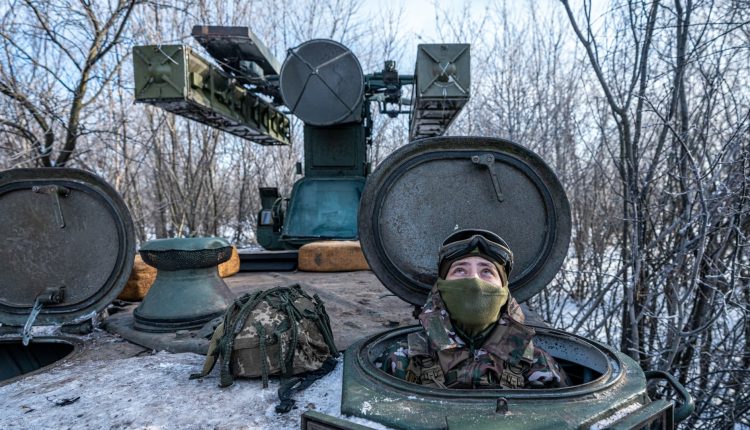 A Ukrainian soldier looks at the sky after hearing the sound of a nearby drone, at the Bakhmut frontline, in Donetsk Oblast, Ukraine on January 13, 2024.