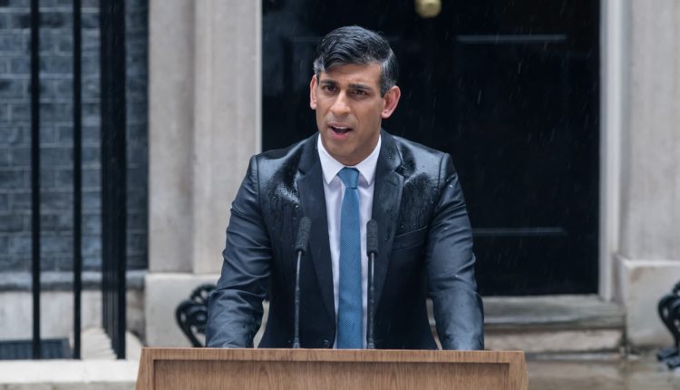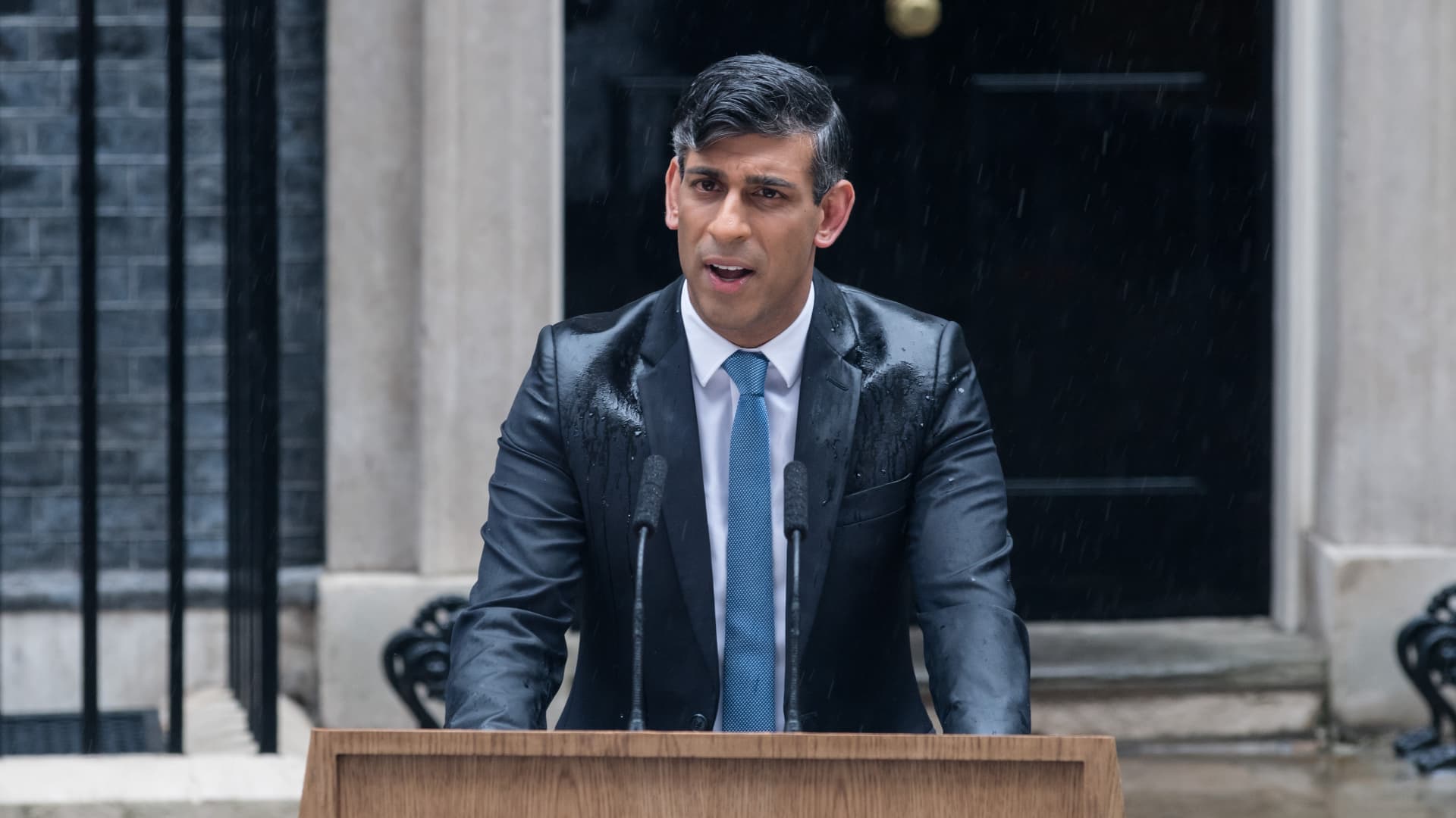 British Prime Minister Rishi Sunak makes a statement in the rain outside 10 Downing Street, announcing the UK general election will take place on 4 July in London, United Kingdom on May 22, 2024.