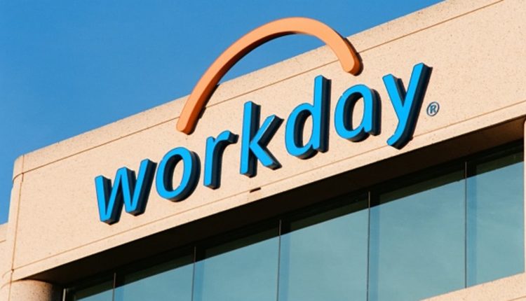 A close-up of the Workday logo on its headquarters in Pleasanton, California, on March 26, 2018.