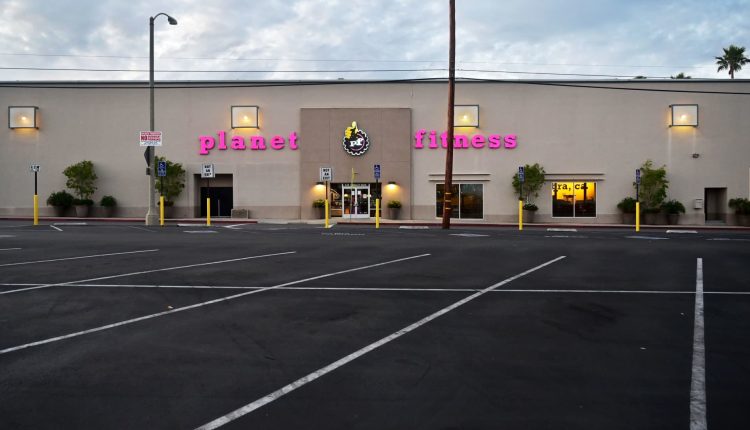 An empty parking lot is pictured in front of a Planet Fitness gym and fitness club in Alhambra, California, on May 12, 2020, after stay-at-home orders in Los Angeles County were extended until July amid the Covid-19 pandemic.