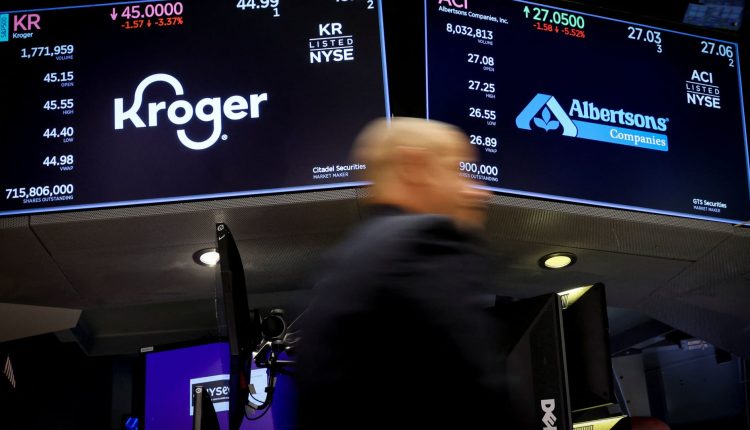 Traders work as screens display the trading information for Kroger Co. and Albertsons Companies Inc. on the floor of the New York Stock Exchange, Oct. 14, 2022.