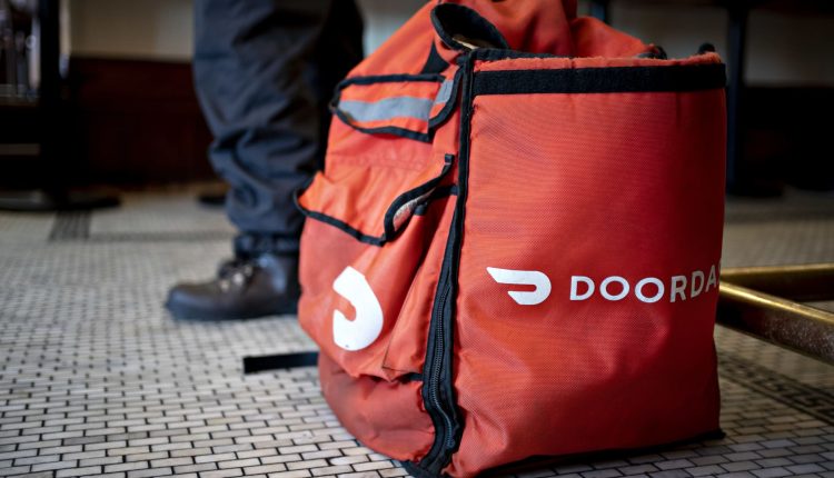 A DoorDash Inc. delivery bag sits on the floor at Chef Geoff’s restaurant in Washington, D.C.
