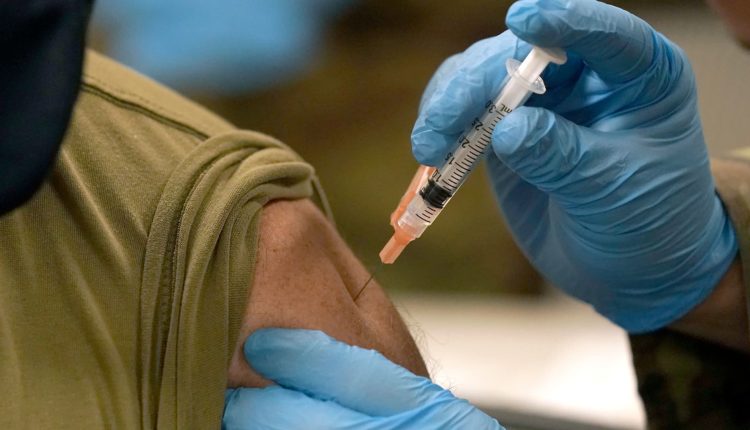 A member of the Mississippi National Guard receives a dose of the Moderna Covid-19 vaccine in his arm in Flowood, Mississippi.