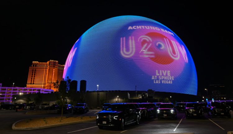 The Sphere is seen during the opening night with U2:UV Achtung Baby Live concert at the Venetian Resort in Las Vegas, Nevada, United States on September 29, 2023.