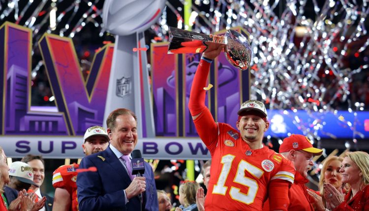 Kansas City Chiefs’ Patrick Mahomes celebrates with the Vince Lombardi Trophy after winning Super Bowl LVIII.