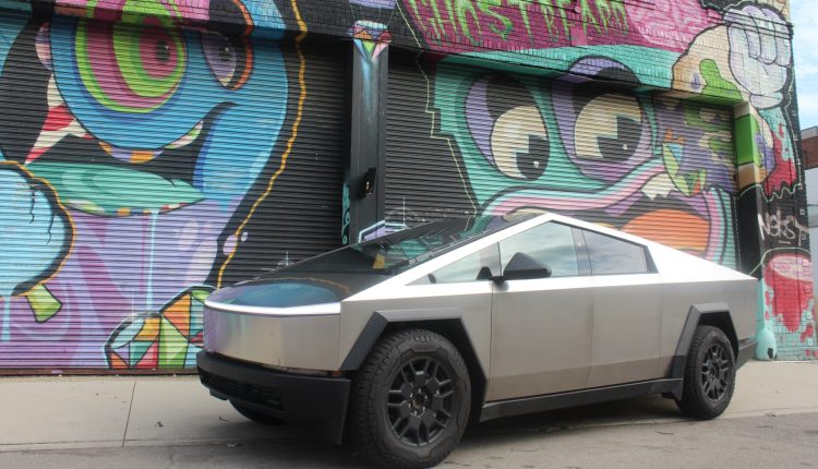 A Tesla Cybertruck in front of a graffiti mural on Aug. 28, 2024 in Detroit.
