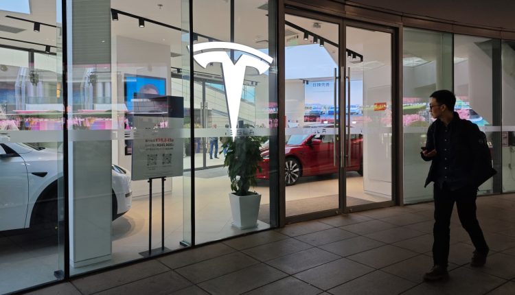 Pedestrians walking past a Tesla store in Shanghai, China, on March 14, 2024.