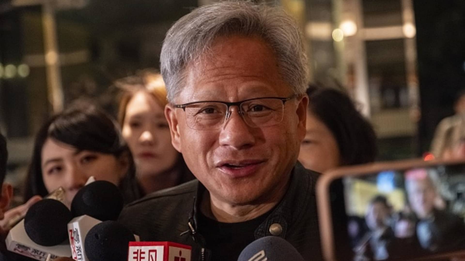 Jensen Huang, co-founder and chief executive officer of Nvidia Corp., speaks to the media as he arrives at an event in Taipei, Taiwan, on Thursday, Jan. 25, 2024.