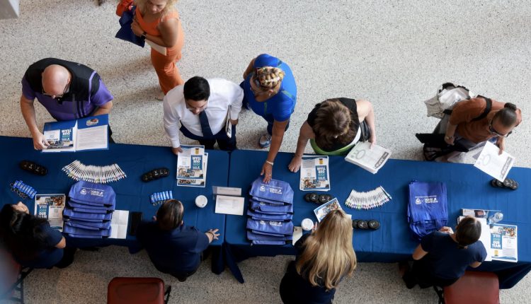 Job seekers attends the JobNewsUSA.com South Florida Job Fair on June 26, 2024 in Sunrise, Florida.