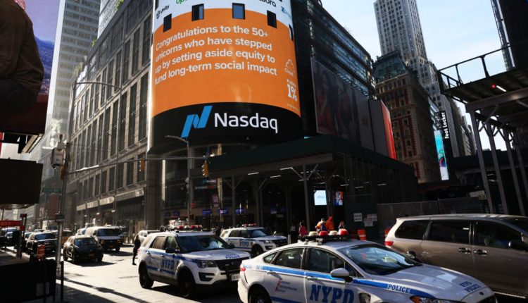 The Nasdaq MarketSite is seen on October 12, 2022 in New York City. The Nasdaq Composite Index yesterday hit its lowest level since July, slipping into a bear market for the second time this year. (Photo by Michael M. Santiago/Getty Images)