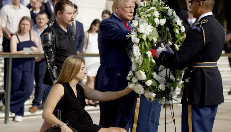 Republican presidential nominee, former U.S. President Donald Trump lays a wreath alongside Marine Cpl. Kelsee Lainhart (Ret.) and and U.S. Marine Corps. Sergeant Tyler Vargas-Andrews (Ret.) who were injured at the Abbey Gate Bombing, during a wreath-laying ceremony at the Tomb of the Unknown Soldier at Arlington National Cemetery on August 26, 2024 in Arlington, Virginia.