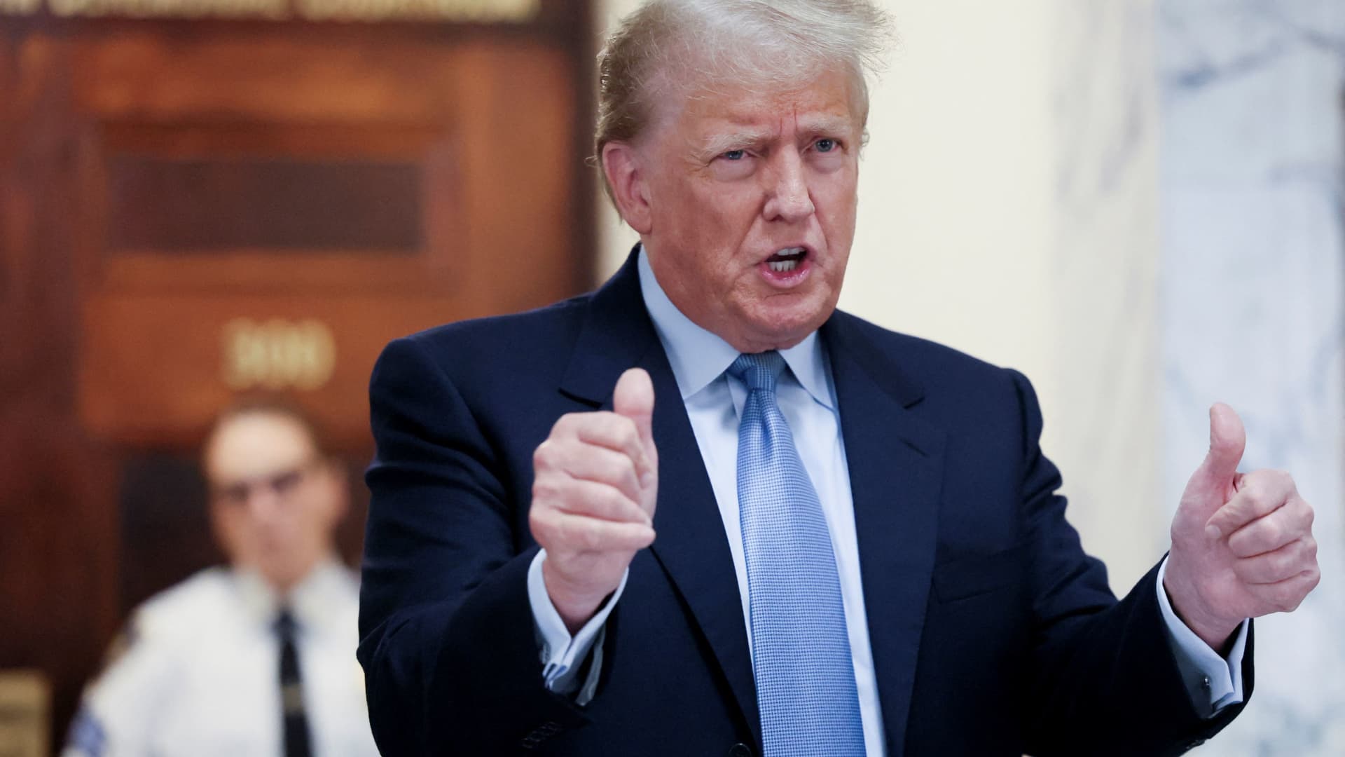 Former U.S. President Donald Trump delivers remarks after exiting the courtroom as he attends his Manhattan courthouse trial in a civil fraud case in New York, October 18, 2023.