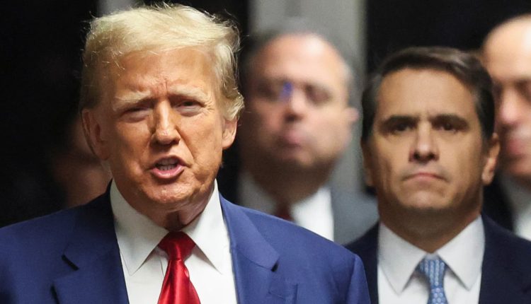 Former U.S. President Donald Trump speaks from the hallway outside a courtroom where he is attending a hearing in his criminal case on charges stemming from hush money paid to a porn star in New York City, U.S., March 25, 2024.