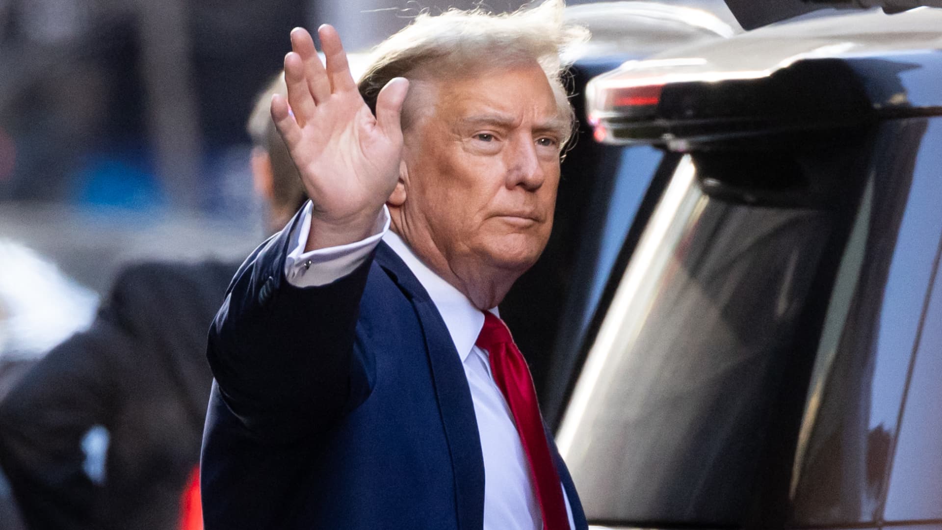 Former US President Donald Trump waves as he departs Trump Tower on his way to Manhattan Criminal Court in New York City on February 15, 2024.