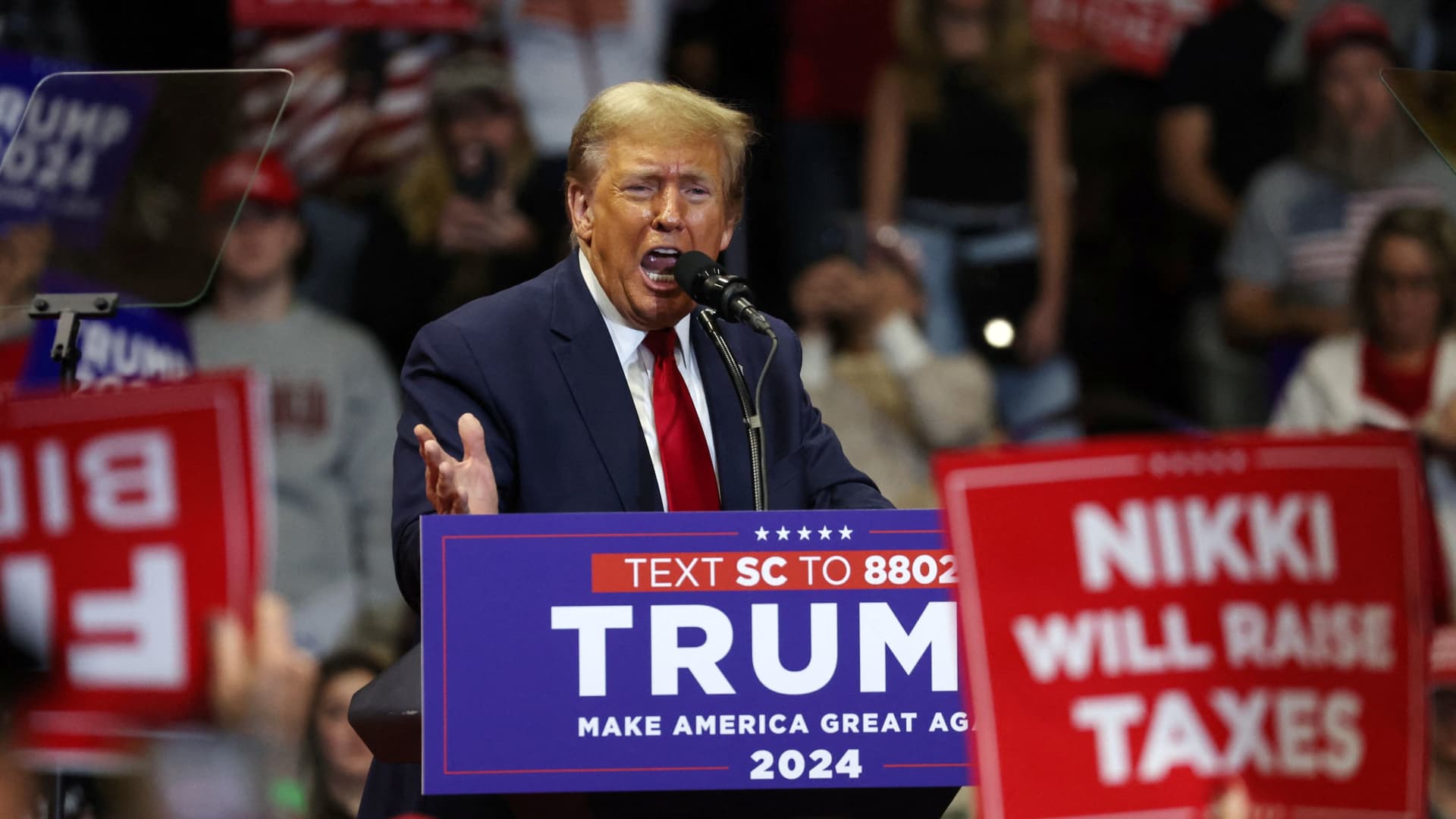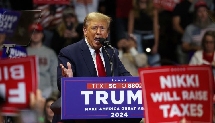 Republican presidential candidate and former U.S. President Donald Trump speaks during a campaign rally at Winthrop Coliseum ahead of the South Carolina Republican presidential primary in Rock Hill, South Carolina, U.S., February 23, 2024.