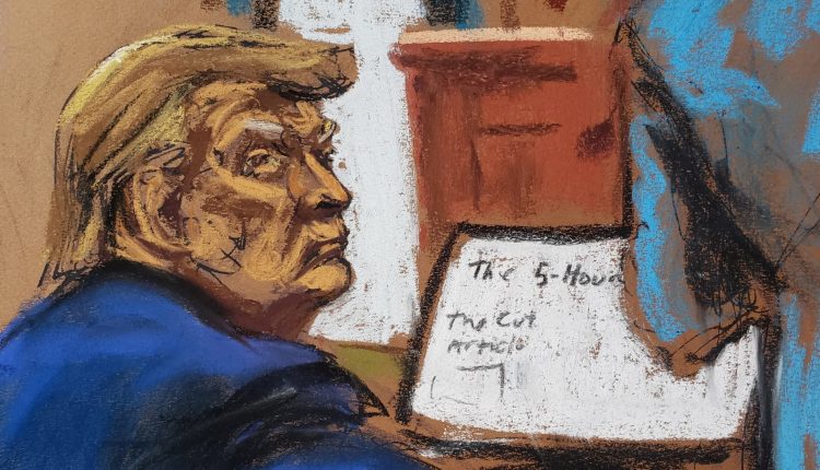 In this courtroom sketch, former U.S. President Donald Trump looks on as his attorney Alina Habba delivers closing arguments during E. Jean Carroll’s second civil trial in which Carroll accused Trump of raping her decades ago, at Manhattan Federal Court in New York City on Jan. 26, 2024.